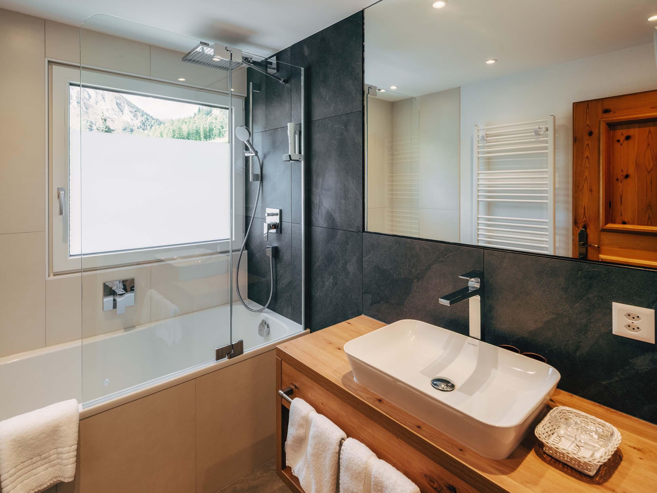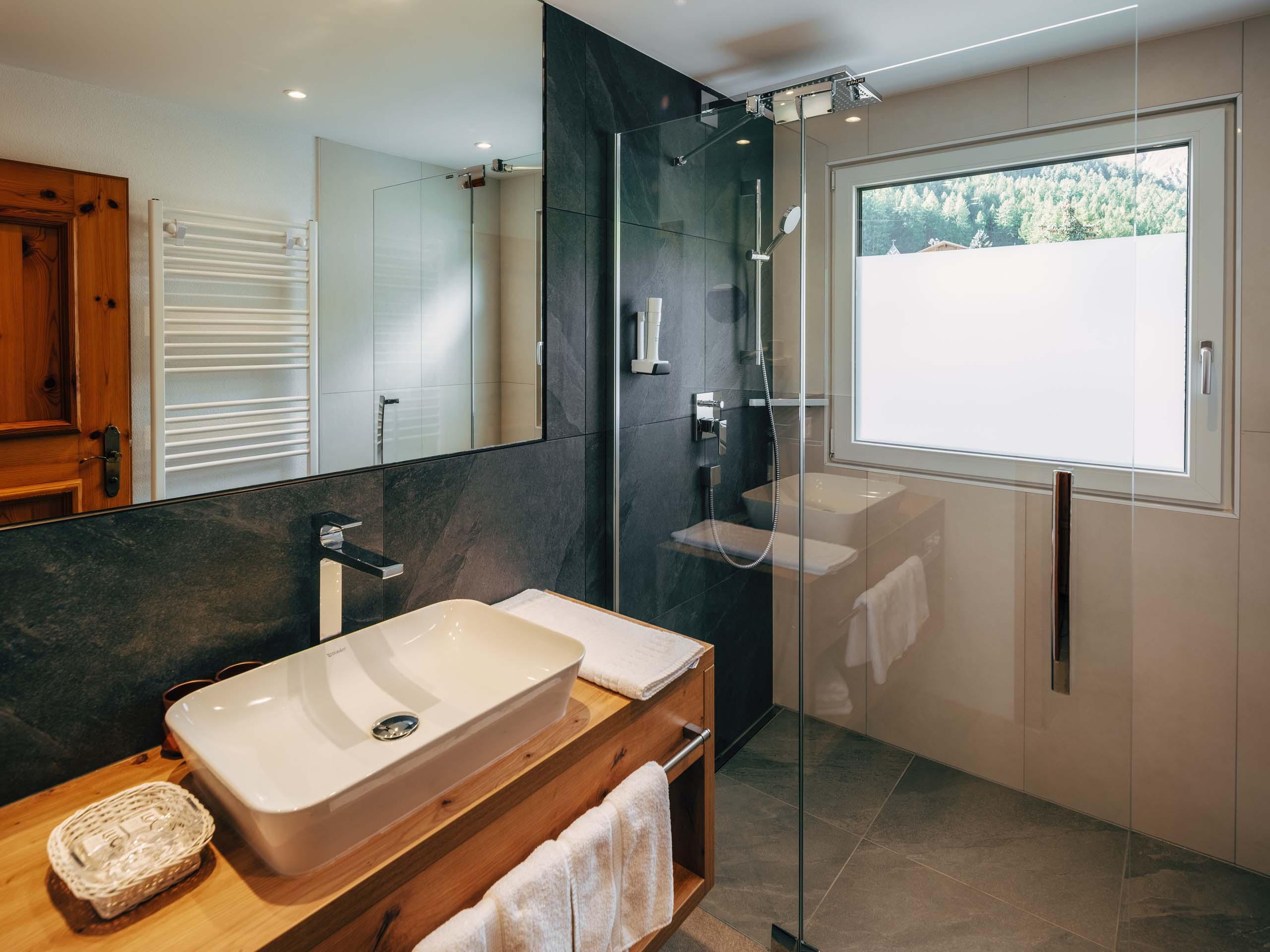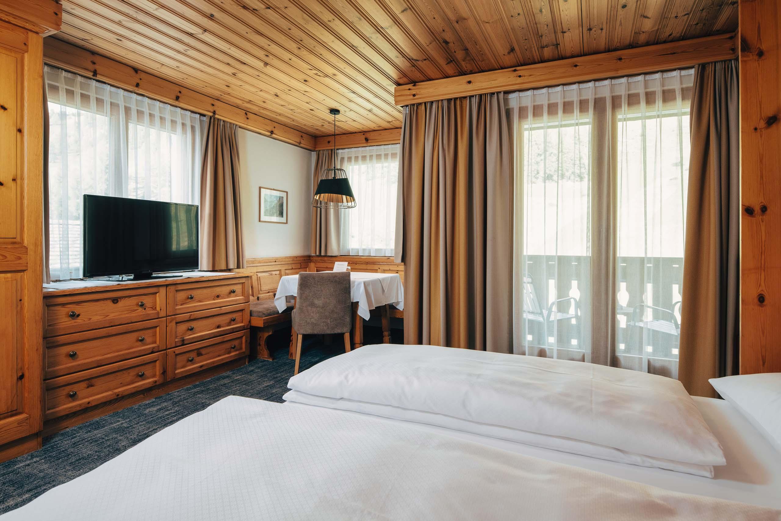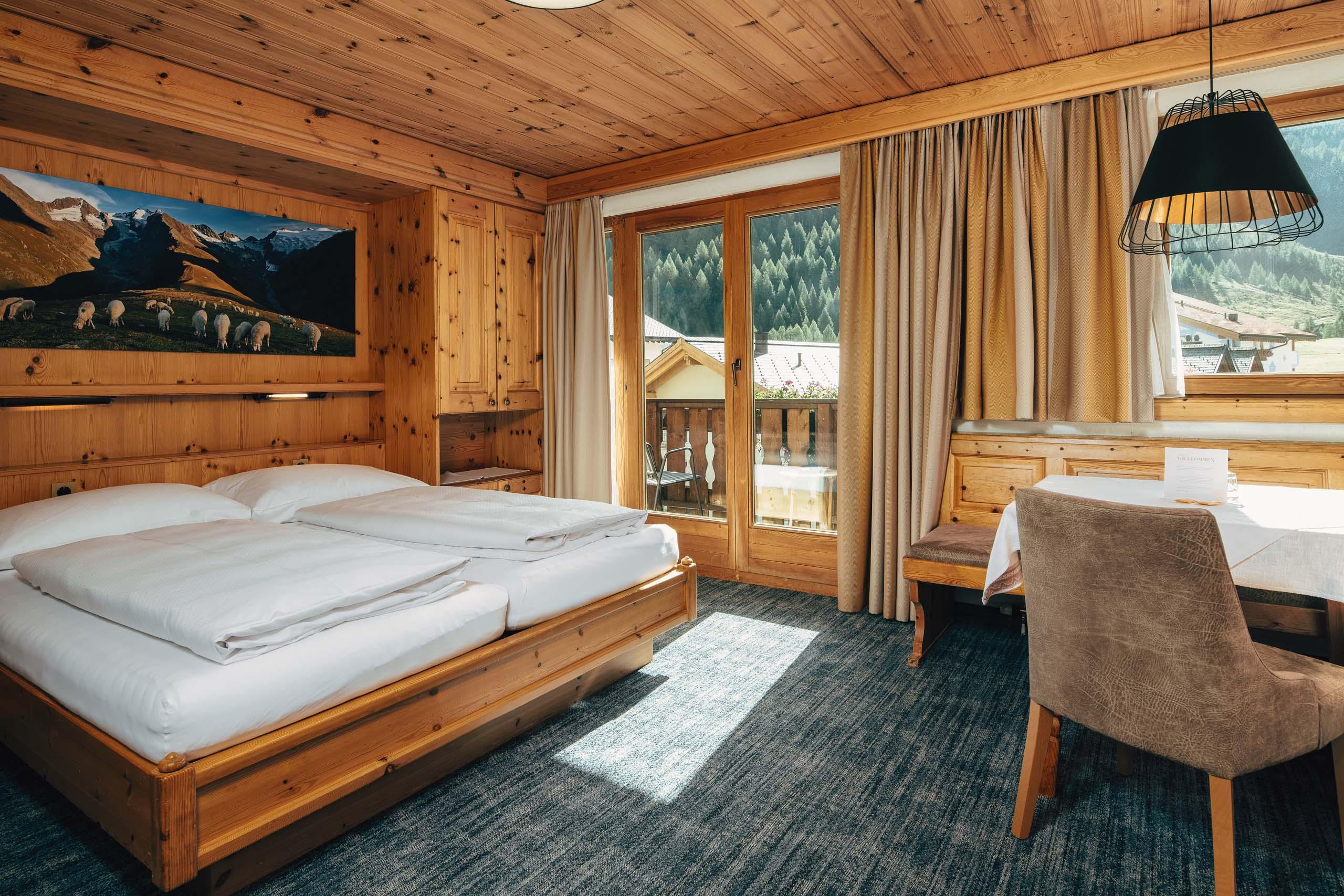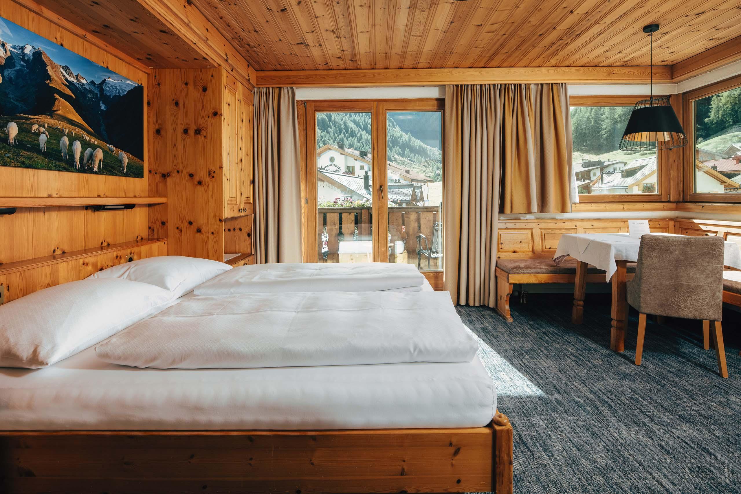 Ein Zimmer für alle, die Raum mögen: für Gedanken, Gepäck oder zum Erholen und Bergpläne-Schmieden. Helles Föhrenholz, klare Linien und der Blick auf die Samnauner Bergwelt tun ihr Übriges. Ob nach Süden oder Norden – hier lässt sich’s gut leben.